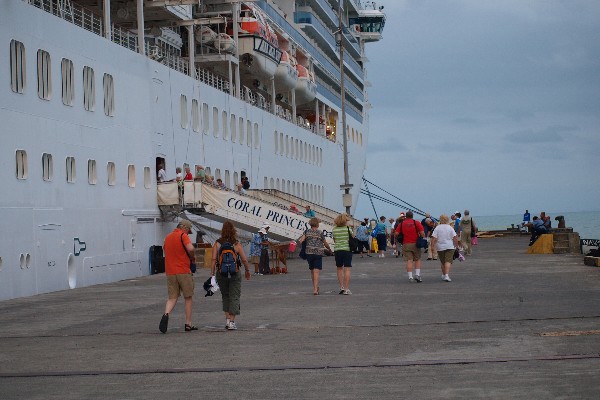 Today we were up at 5:45 am. After a quick breakfast at 6:30 we assembled in the Princess Theatre at 7:15. Our tour to San Jose was scheduled to leave Limon at 7:30. We departed the ship and boarded the bus by 7:35. This tour was to last 9 ½ hours so we're in for a long day. click picture to enlarge From the pier we hit the highway for our three hour drive to the capital of Costa Rico, San Jose. Our guide Mario was a very entertaining Costa Rican native. Enroute we passed from the coastal lowlands with its endless banana plantations, through the mountains of Braulio Carrillo National Park, over the continental divide and down into the central valley of San Jose. The mountain passes were amazing. The terrain was dense rain forest, straight up and straight down, more rugged than could be imagined. click picture to enlarge Our first stop in the capital was at the National Theatre, built and in continuous use since 1897. All of the original mahogany seats are still in use and the seating capacity is 1,200. While touring this national treasure, we were treated to a short musical interlude by some members of the National Philharmonic Symphony who happened to be practicing in the second floor foyer. Very enjoyable. click picture to enlarge From there we again boarded our bus for the short ride over to the National Museum. This former military fortress now houses a butterfly gallery and a vast collection of archaeological and historic artifacts. click picture to enlarge For lunch we had a buffet of Costa Rican dishes at the Le Chandelier Restaurant in downtown San Jose. The buffet consisted of casado (rice, black beans), roast chicken and olla de carne (beef broth with chunks of beef). Very tasty and quite a nice lunch all the way around. However, as soon as lunch was done it was back on to the bus for the long ride home. click picture to enlarge I have to give our bus driver a lot of credit. The main highway between the coast and the capital is a narrow, heavily travelled, winding road that he navigated with apparent ease. Any break in the traffic, he would floor it and barely squeak around slower moving vehicles of which there was a never ending supply. And to add to the excitement of the drive, as we were traversing the continental divide through the most treacherous part of the route, we were slowed down by an accident that occurred in the opposite lane. A car was over on its side and some people had a man stretched out on the road beside it. It looked like he had either missed the turn and hit what looked like a totally inadequate guardrail (the drop off the road would have been at least a thousand feet if he'd have gone over) or he had been forced over by another vehicle. A bit of a sobering scene. click picture to enlarge When we were about a ½ hour from the ship, our guide thought we'd have time for a brief stop at a pineapple plantation along the way. It was a welcome stop as the bus ride was fast becoming very tiring. There was a gift shop and we were also treated to some complimentary pineapple slices they put out for us. Our guide Mario wasn't kidding when he said Costa Rican pineapple was the best in the world. click picture to enlarge Back on the bus, we inched through traffic for our final leg and finally arrived back at the pier at 5:35. We were an hour overdue and final boarding was supposed to be at 5:30. We were the last group on and the gangplank was hoisted aboard right behind us. It had been a long but good day and we were quite happy to be aboard. click picture to enlarge We went right down to dinner at 5:45 and the ship left port at 6:00 sharp. We all ended up ordering the Gamberi Scampi Diovolo. However, Shel was torn between having the Scampi or the fish of the day which was Turbot. No problem though as our waiter Soto brought the spoiled brat an order of each. The Turbot was excellent and would have been an excellent choice as well. The night before our first formal night, Jackie our assistant waiter told us she liked formal night because Soto would have to take a bath for the occasion. As tomorrow evening was formal night again, we reminded Soto he would have to take a bath before dinner. He agreed and mentioned under his breath that he might even change his underwear too. To his dismay, Shelly heard him and we had a red-faced Soto for the rest of the meal. In all seriousness though, from what we could tell Soto's hygiene was impeccable every night and it was all in good fun. After dinner, we ended up in the casino for about an hour, where Lee hit a $62.50 payout on a $0.15 bet. She wisely cashed out shortly thereafter with most of her winnings intact. Then it was back to our veranda for a nightcap where I caught up on my notes. We were in bed by midnight. |